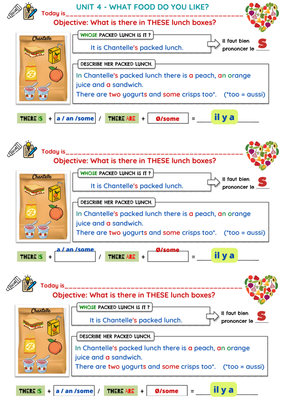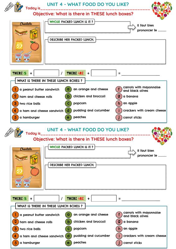 Les élèves doivent les coller dans le cahier et les décrire selon le modèle en utilisant seulement "in my packed lunch/in my lunchbox"